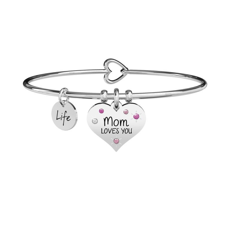 Bangle in acciaio con ciondolo a cuore con cristalli colorati. Incisione smaltata e cristalli sul ciondolo - Chiusura a cuore - Misura unica, diametro 6 cm - Materiale: Acciaio 316L, Cristallo