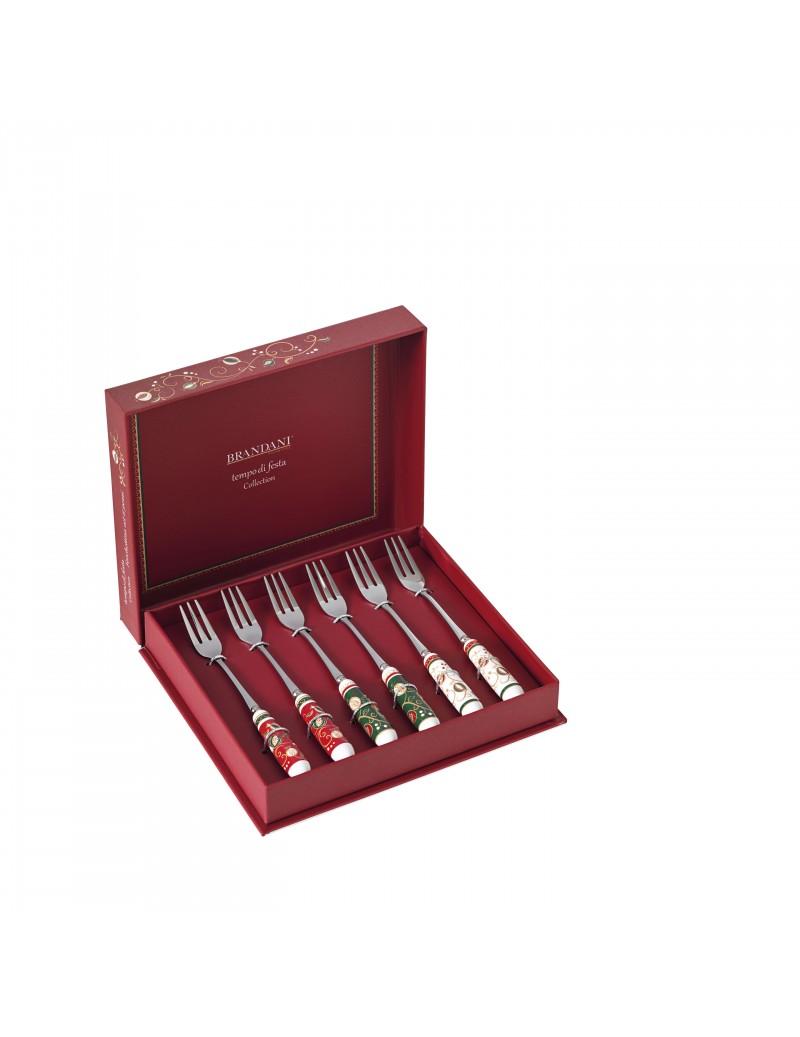È tempo di festa: nelle vostre case, ed in casa Brandani! La nuova linea Tempo di festa firmata Brandani, ideata per rendere magica la tua tavola, sa di gioia e di tepore. Il set di forchettine Tempo di Festa, in acciaio inox con manico in ceramica finemente ornata dai classici decori natalizi e gli affascinanti colori dell’inverno, è l’accessorio che mancava per dare quell’esclusivo tocco in più al tuo momento speciale. Composto da 6 pezzi raccolti in una deliziosa confezione, il set forchettine Tempo di Festa è perfetto anche come graziosa idea regalo. Perché ogni singolo istante assieme ai tuoi cari, merita di essere celebrato: è “Tempo di Festa”, si... ma anche di affetti!