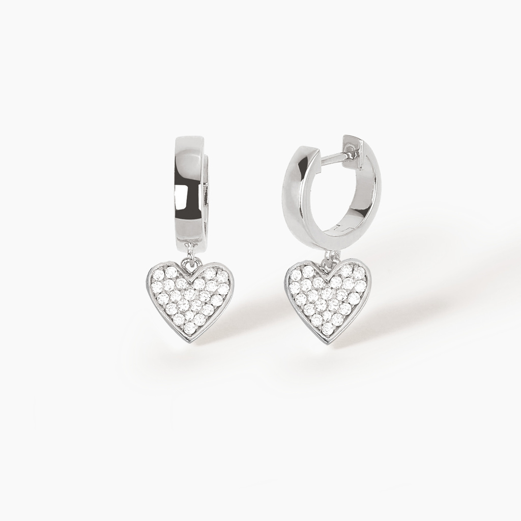Orecchini a cerchio in argento con pendente a cuore in pavé di zirconi. • Chiusura a scatto • Misura unica • Materiale: Argento 925, Zirconi